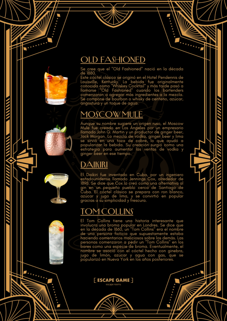 Aunque en 1924 es algo complicado encontrar un local donde se sirvan bebidas alcohólicas parece que tendréis suerte. Corre el rumor de que si le decís la palabra Margarita a uno de los camareros rellenará vuestra copa discretamente…