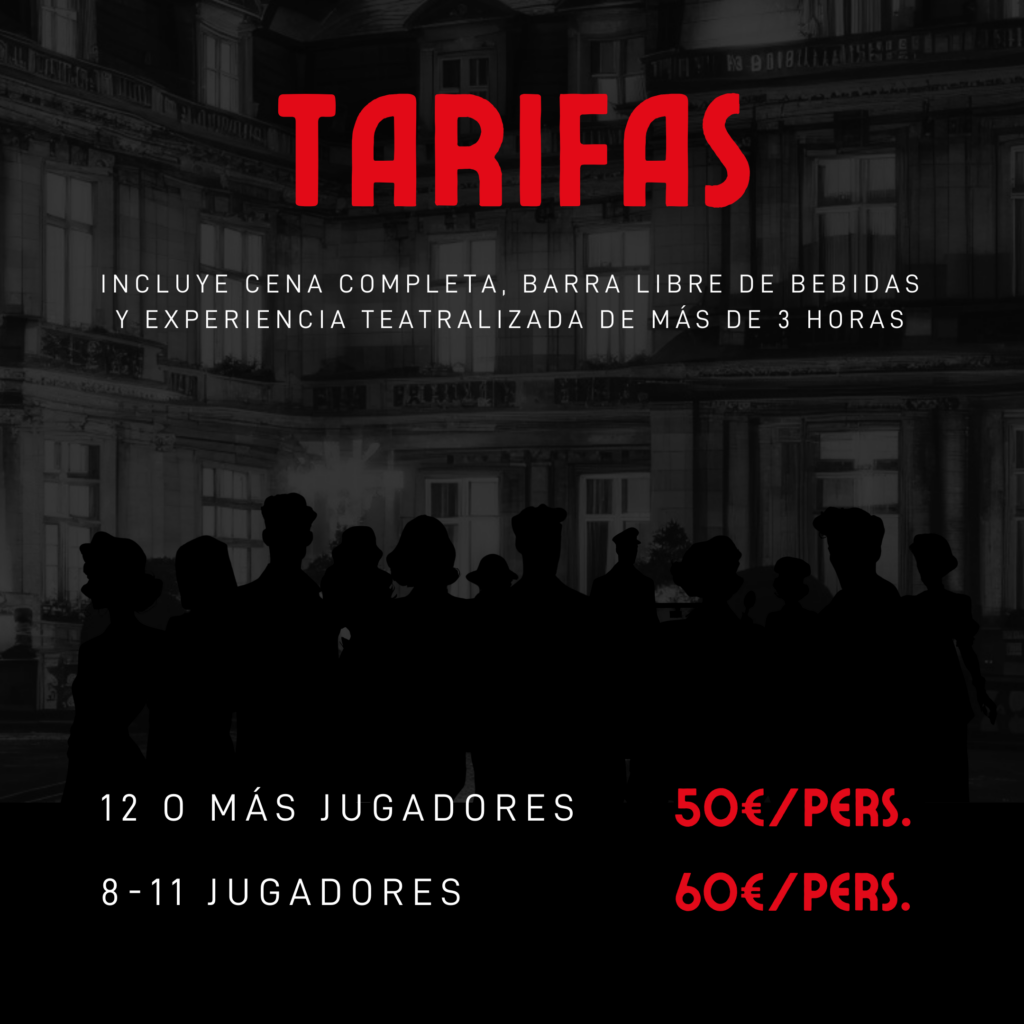 El precio incluye la cena, barra libre de Agua, Vino y Cerveza hasta el postre y la experiencia de juego completa con más de 3 horas de duración aproximadamente.
